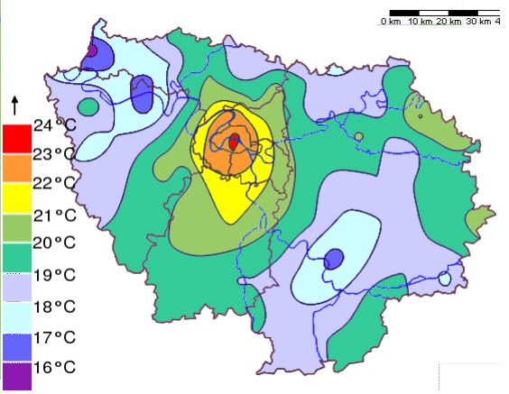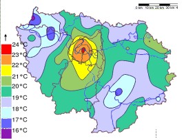 Ce fut le cas lors de la canicule de 2003 : la vague de chaleur qui a touché l’Europe a provoqué plus de 70 000 morts, la plupart en milieu urbain (cf figure : Canicule 2003 : Îlot de chaleur nocturne mesuré à Paris (moyenne de 15 nuits consécutives)).