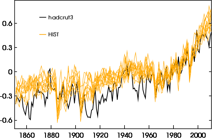 La figure ci-dessus représente l’évolution de la moyenne planétaire de la température de l’air près de la surface simulée par CNRM-CM5 (courbes en orange) entre 1850 et 2010. La courbe en noir représente les observations HadCRUT3. Dans les deux cas il s’agit d’écarts de cette température par rapport à la moyenne calculée sur la période 1961-1990. Dix simulations ont été réalisées avec CNRM-CM5, de manière à évaluer la variabilité climatique interne : le climat simulé peut être légèrement différent d’une réalisation à l’autre. Ces simulations prennent toutes en compte l’évolution des concentrations atmosphériques des gaz à effet de serre et des aérosols. Contrairement aux gaz à effet de serre, les aérosols atmosphériques, petites particules en suspension, ont un effet refroidissant sur le climat. Les variations de l’intensité lumineuse du soleil ont également été introduites dans CNRM-CM5. On estime en effet que ces variations (ici, le cycle de 11 ans) peuvent induire des variations de la température de la planète de l’ordre de 0,1°C. Enfin, les éruptions volcaniques majeures sont également représentées : chacune d’entre elles se traduit par un refroidissement global de plusieurs dixièmes de °C, relativement brutal mais temporaire. Cet effet est notamment visible dans nos simulations en 1883 (Krakatoa), 1902 (Santa Maria), 1964 (Agung), 1982 (El Chichon) et 1991 (Pinatubo). L’impact des volcans apparaît également dans les observations, même s’il est probablement sous-estimé dans le cas de l’éruption du Krakatoa. Enfin, l’évolution générale à la hausse de la température est correctement simulée par le modèle : une première phase de réchauffement des années 20 aux années 40, puis un léger refroidissement, suivi d’un réchauffement prononcé à partir de la fin des années 70.
